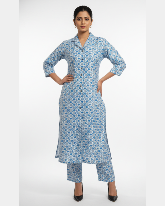 Blue Bangalore Silk Printed Tunic & Pant Set | Kurti Set