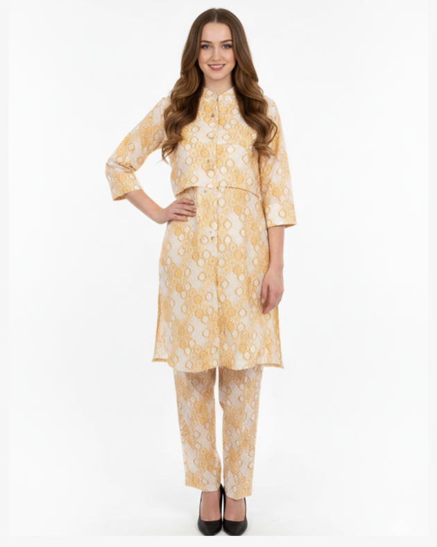 Gold Bangalore Silk Printed Kurti with Pants | Tunic Set