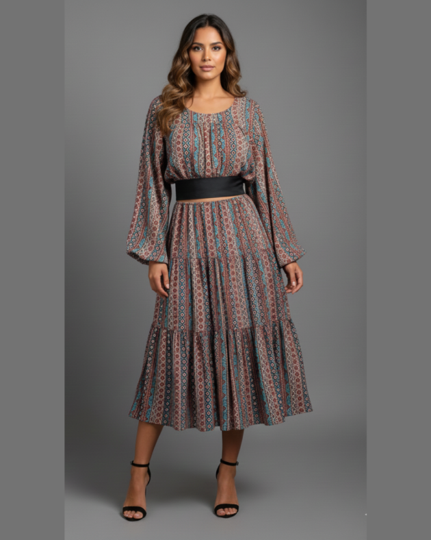Women’s Midi Dress with Waist Belt | Long Sleeve Flared Dress