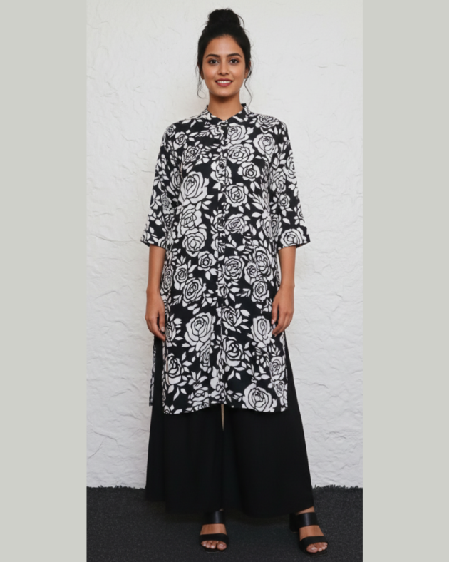Rayon Floral Print Tunic | Black & White A-Line Long Top