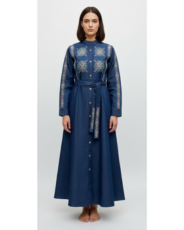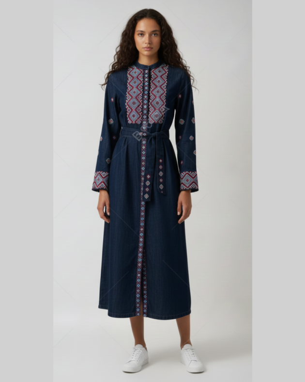 Sustainable Embroidered Denim Abaya Jacket – Eco Fashion
