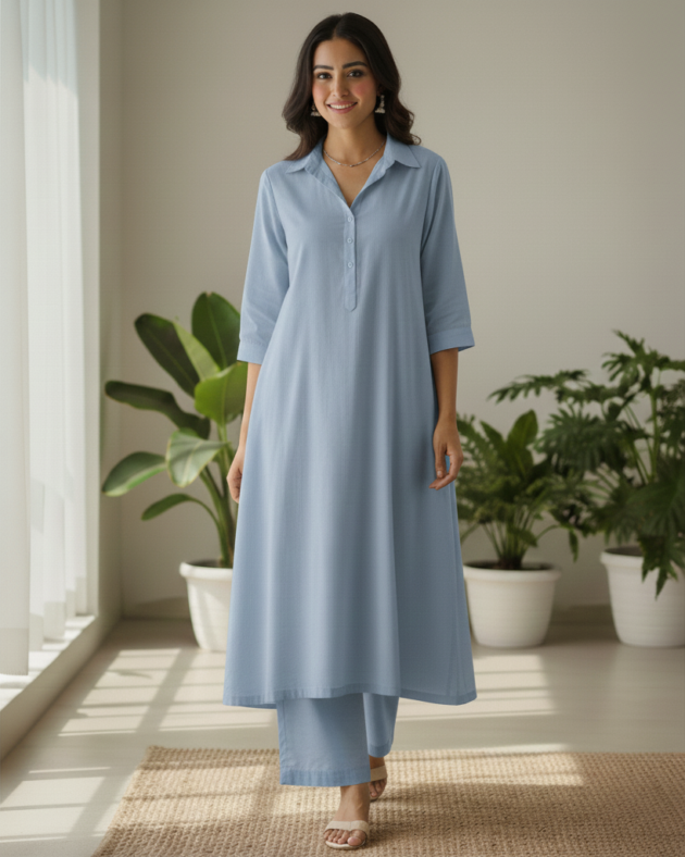 Chic Powder Blue Cotton Shirt Tunic Set | European Kurta set
