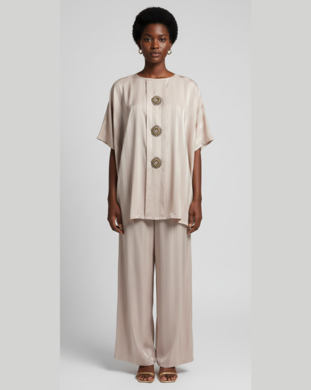 Beige Striped Satin Kaftan Co-ord Set – Luxury Resort Wear