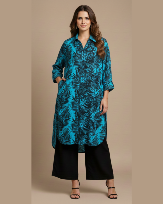 Women’s Rayon Printed Longline Tunic – Tropical Leaf Pattern