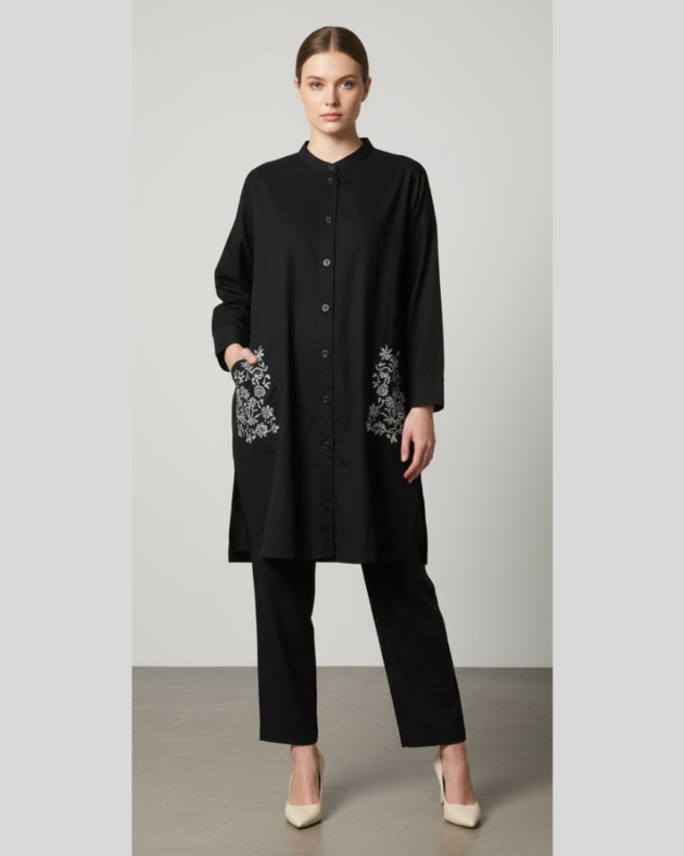 Women’s Embroidered Shirt-Style Tunic & Pant Set in Poly Crepe
