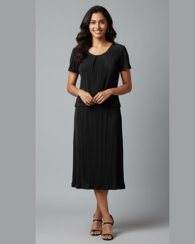 Women’s Black Textured Co-Ord Set | Short-Sleeve Top & Midi Skirt