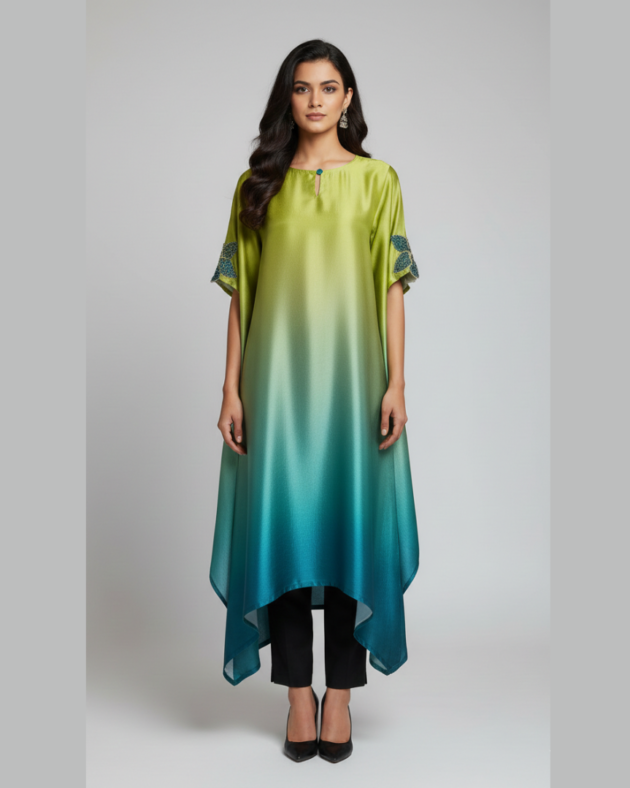 Women’s Green–Teal Ombré Long Kurta – Asymmetrical Tunic