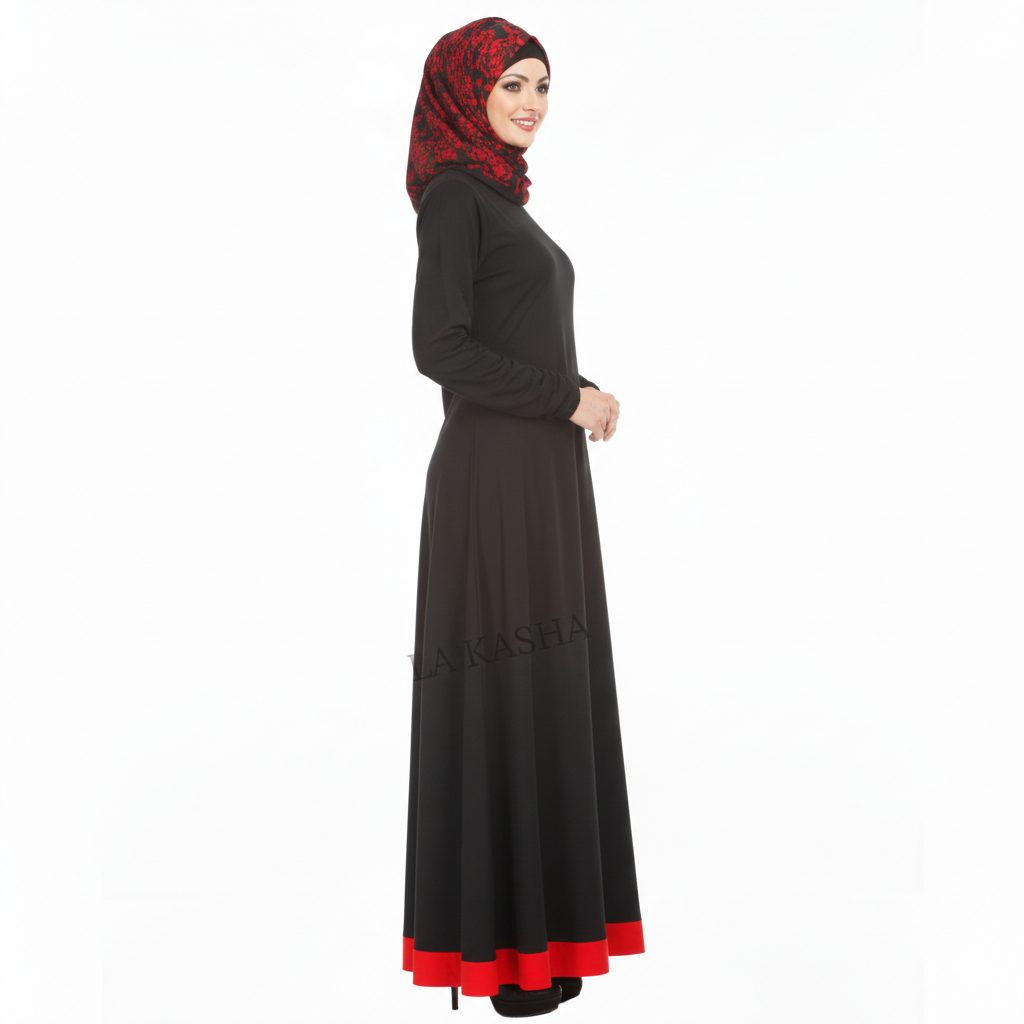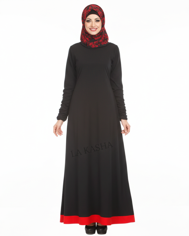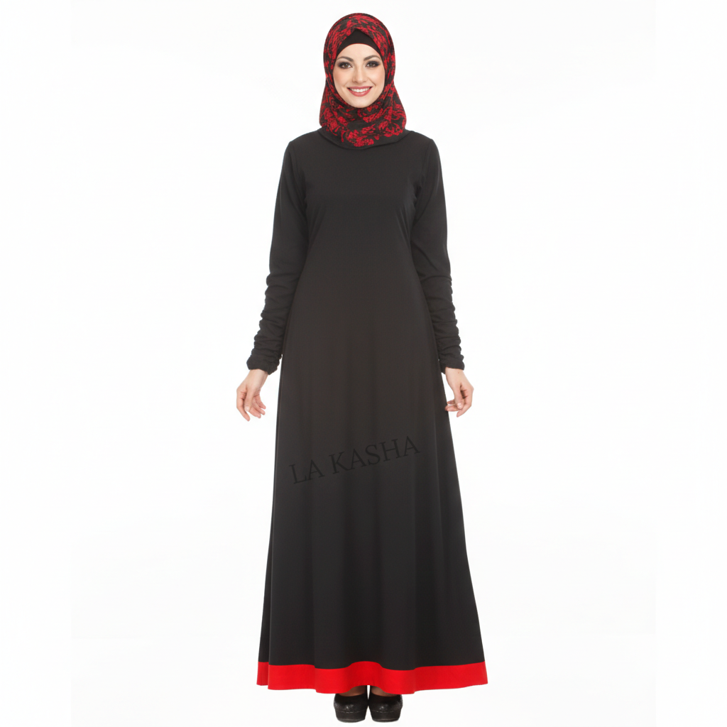 This elegant A-line abaya is designed for women who appreciate refined modest fashion with a modern touch. Crafted from premium poly crepe fabric, it offers a smooth, lightweight drape that flows gracefully with every movement. The minimalist black base is elevated by a bold contrast border at the hem, adding a subtle yet striking highlight to the overall silhouette.