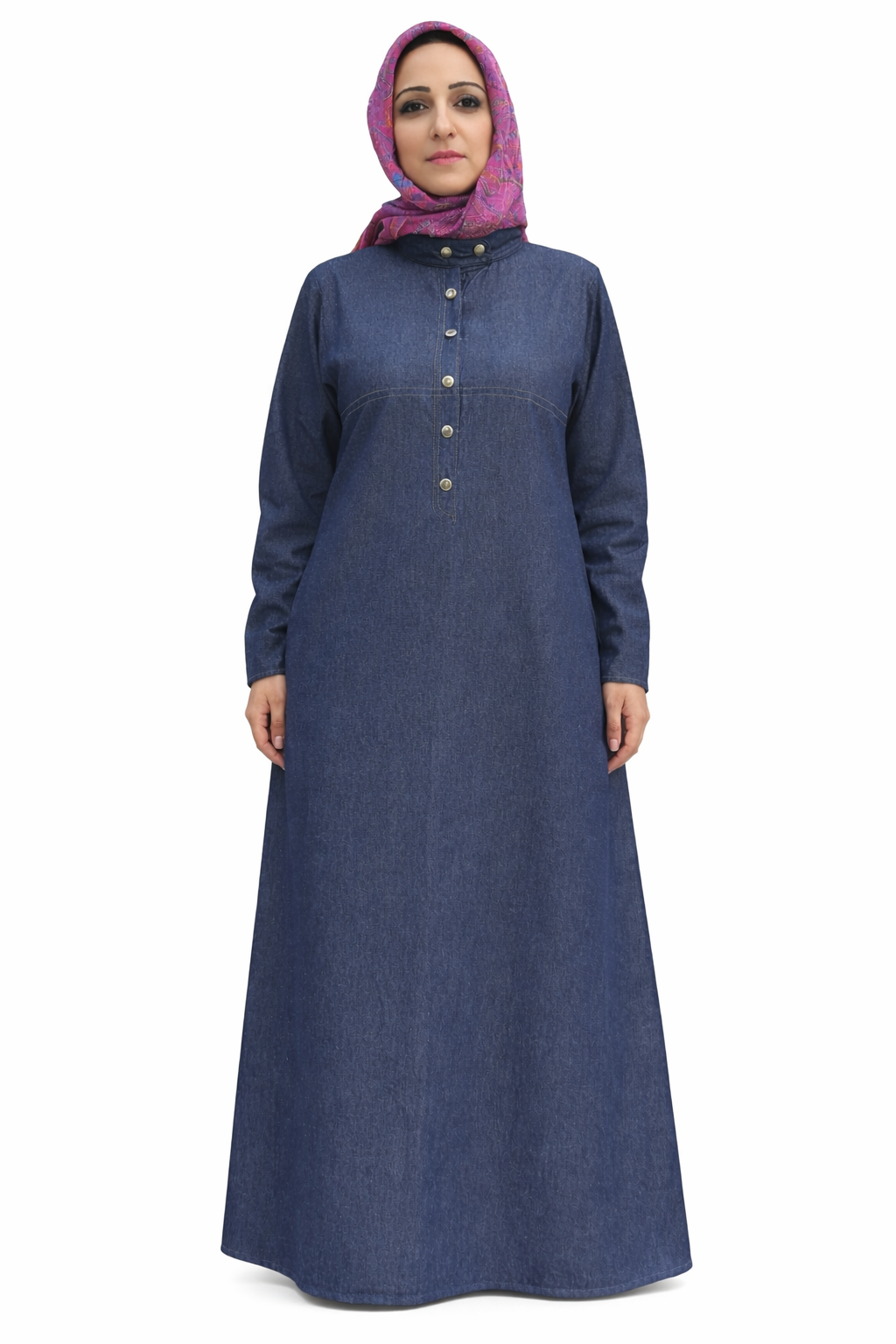 This modern women’s abaya is crafted from stretchable lightweight denim, offering exceptional comfort, flexibility, and a clean structured look. Designed with a refined band collar, it delivers a minimalist aesthetic that blends contemporary style with modest elegance.