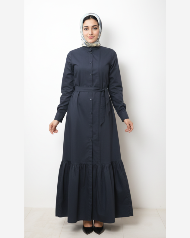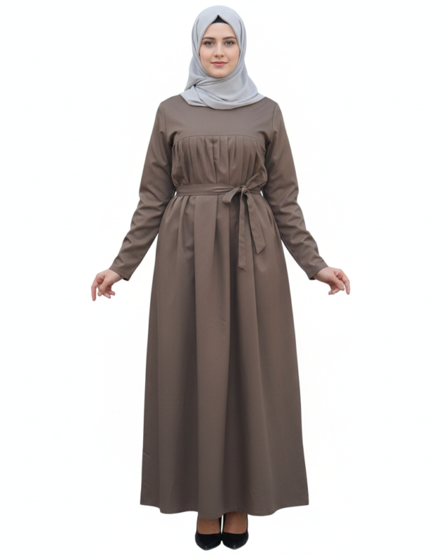 The adjustable waist belt enhances shape while maintaining modesty, making it suitable for both everyday wear and semi-formal occasions. Finished with functional side pockets and a button-front bodice, this abaya blends practicality with timeless style, ideal for modern European modest wardrobes.