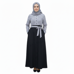 This elegant women’s abaya is crafted from lightweight twill fabric, offering a smooth texture, breathable comfort, and a refined drape. Designed with a structured upper panel and a contrasting flowing lower section, it creates a balanced and flattering silhouette.