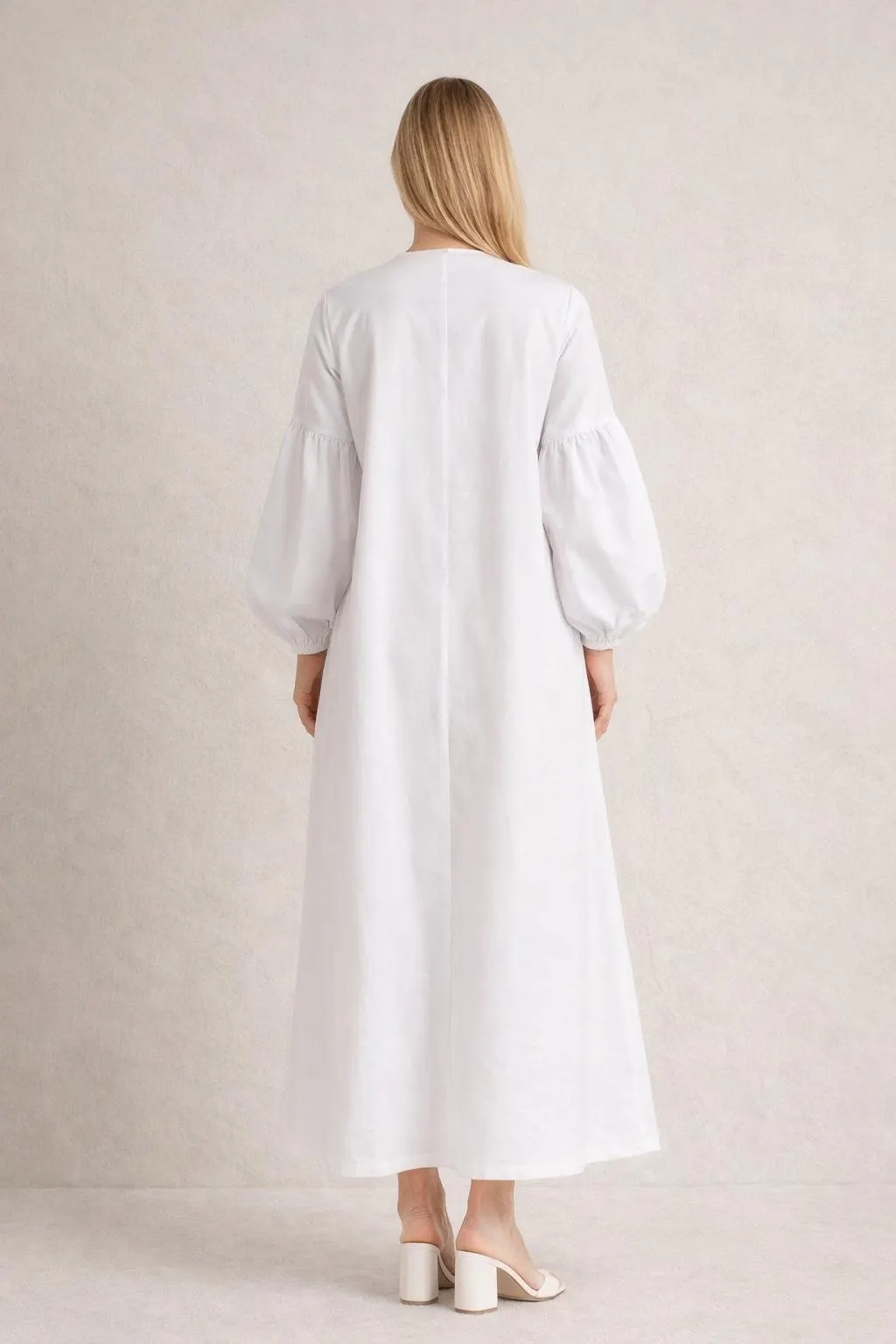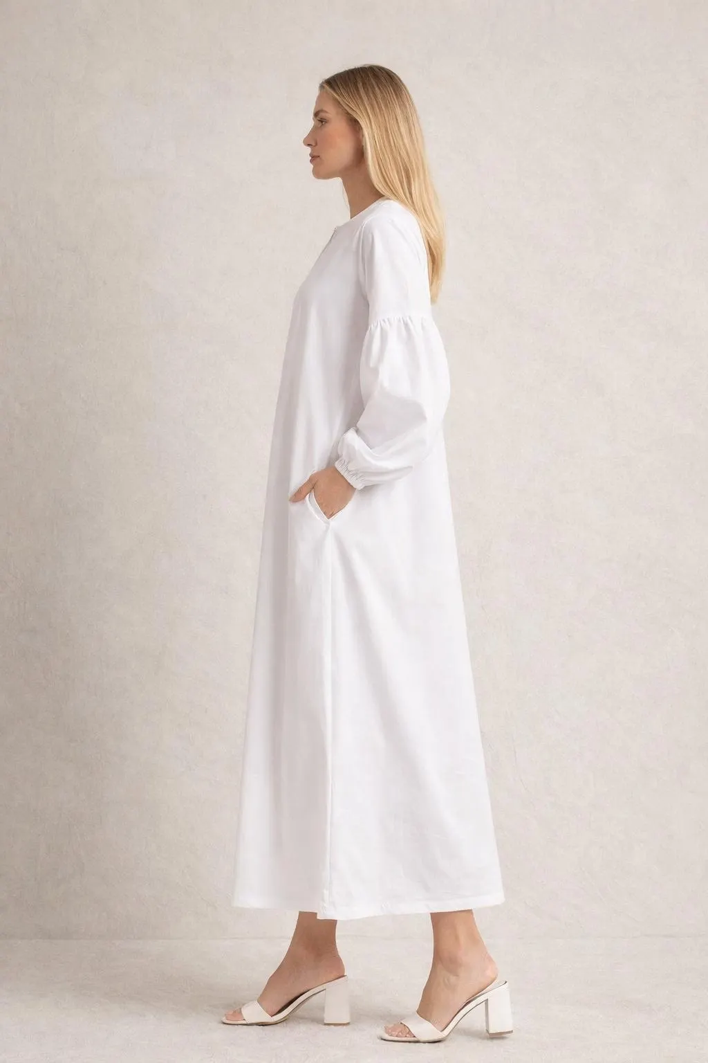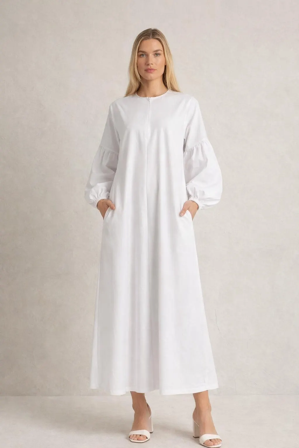 Designed with functional side pockets, this abaya combines practicality with minimalist elegance. The soft gathered sleeves with elastic cuffs add a feminine touch while keeping the overall design simple and modern.