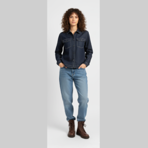 Cut from premium heavyweight denim, this jacket is designed to act as your primary outer layer during the transitional seasons. The deep indigo dye provides a sophisticated, “raw” look, while the contrasting tobacco-colored stitching highlights the expert craftsmanship of the pointed collar and utility pockets. Whether paired with matching denim for a bold monochromatic look or thrown over a midi dress, this jacket is an essential pillar of the sustainable capsule wardrobe.
