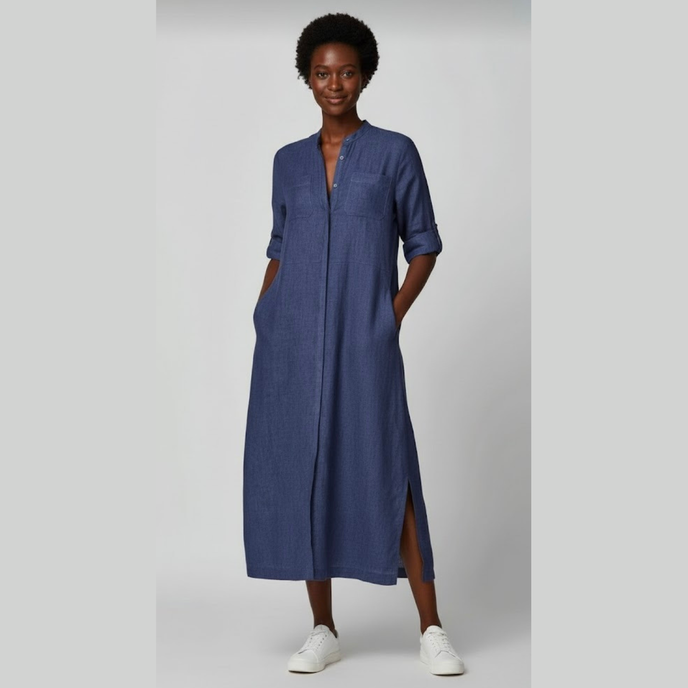 The dress features a sophisticated mandarin collar with a partial button-down front for a clean, modern look. Adjustable roll-tab sleeves allow you to wear it full-length or three-quarter style. Functional side pockets and twin chest pockets add practicality, while subtle side slits provide ease of movement and a flattering drape.
