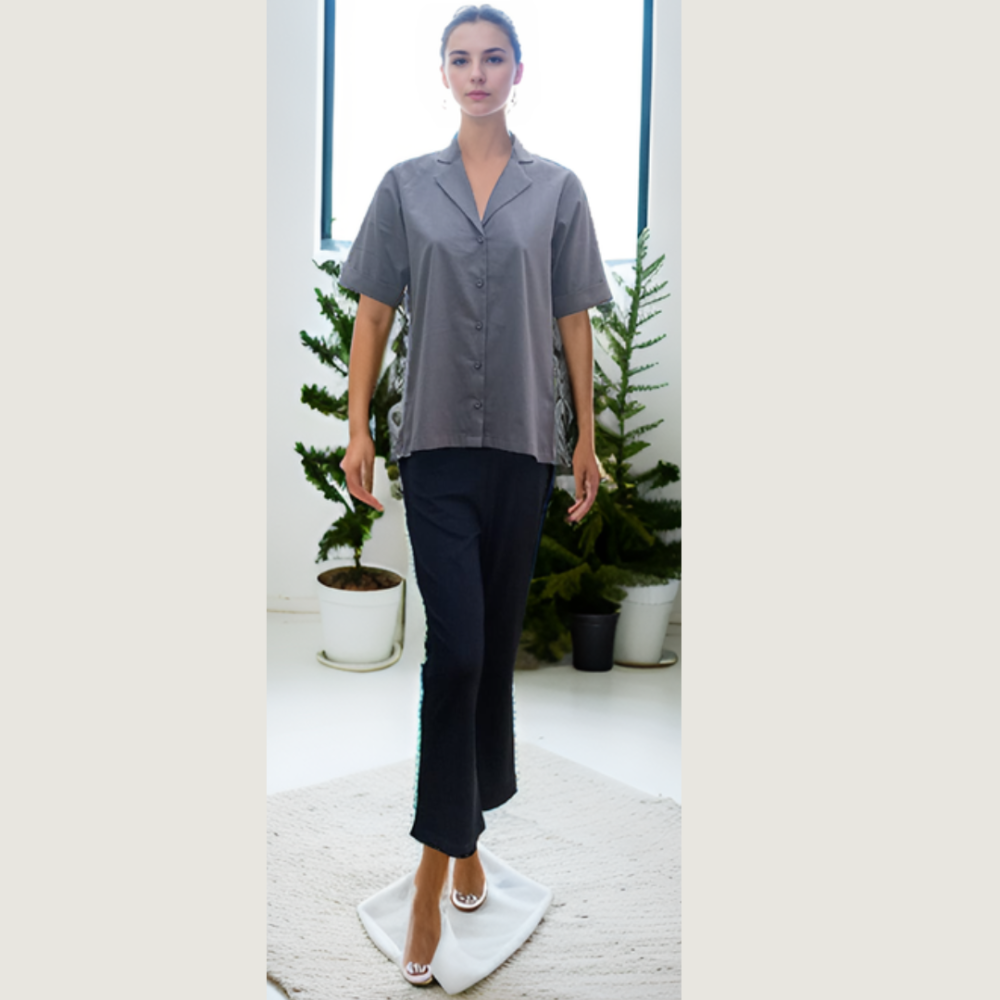 Featuring a relaxed silhouette, short sleeves with folded cuffs, a clean button-down front, and a smart open collar, this piece blends minimalist design with practical elegance. Ideal for work, travel, or casual styling, it embodies the essence of sustainable fashion without compromising on sophistication.