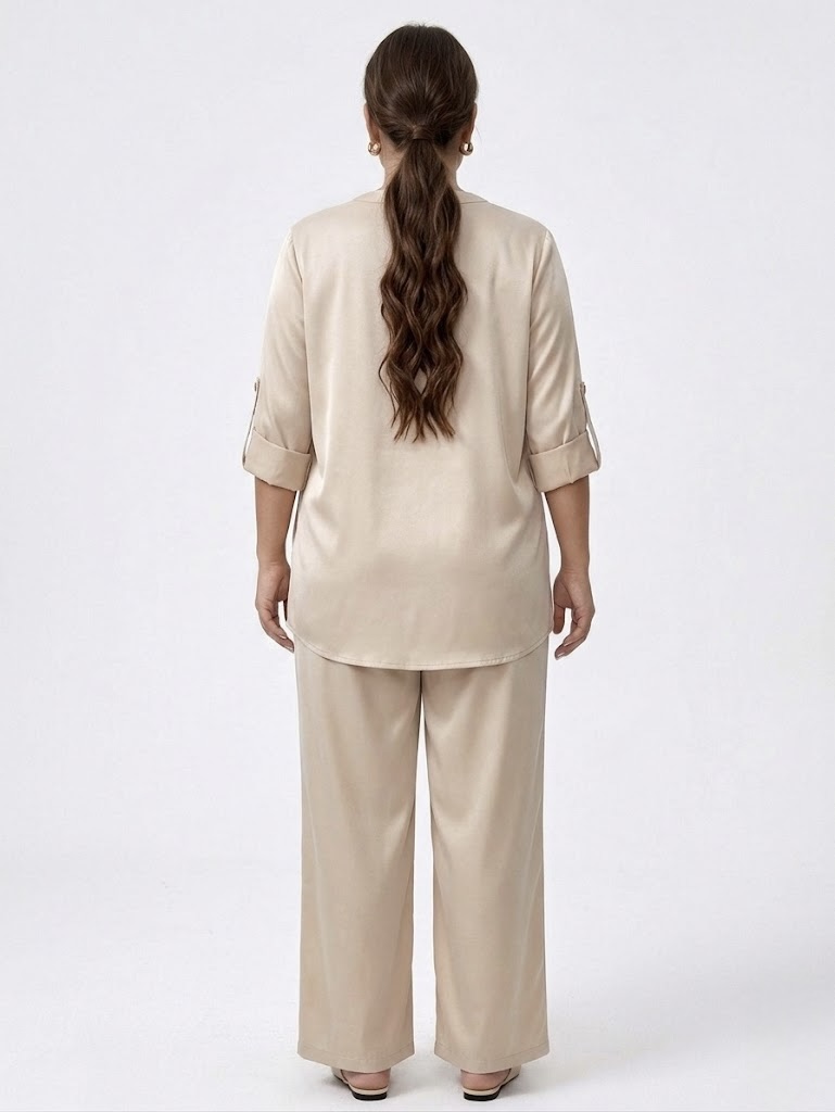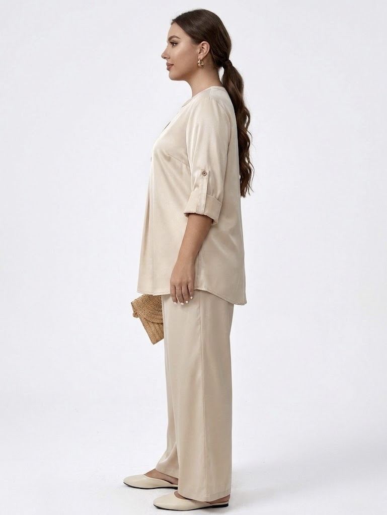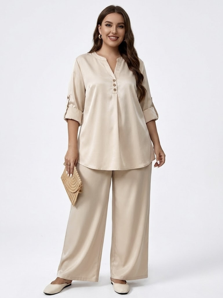 Crafted from premium glazed cotton, it combines a soft, breathable feel with a subtle satin-like sheen, keeping you cool while looking elevated. The tunic features a flattering V-neckline, button details, and adjustable roll-up sleeves, while the wide-leg pants provide a flowy, non-restrictive fit with a comfortable elastic waistband.