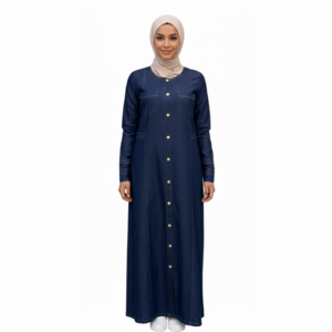 Crafted from deep, premium unwashed denim, the fabric offers a high-quality, structured look that is naturally resistant to wrinkles—an indispensable feature for modest travel. The maxi-length silhouette provides elegant, full coverage. Its loose, flowing cut offers ample room, making it an excellent and stylish option for maternity wear. When fully buttoned (if applicable), the design maintains a polished, coat-dress aesthetic suitable for professional settings.
