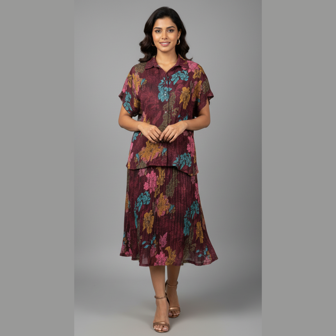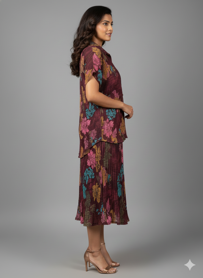 Elevate your wardrobe with a touch of botanical artistry. This two-piece pleated set captures the essence of 2026’s “Lush Botanical” trend, featuring a sophisticated palette of deep wine, teal, and mustard ochre. Designed for the modern European woman, this set offers a seamless transition from a polished office look to an elegant evening ensemble.