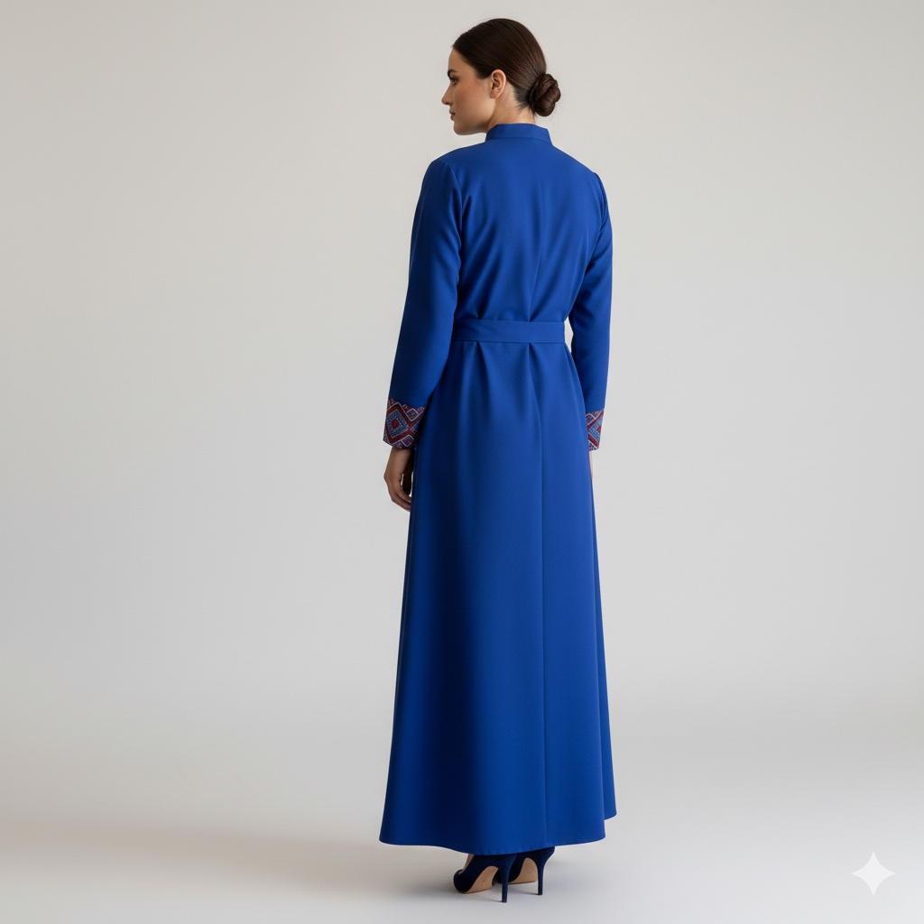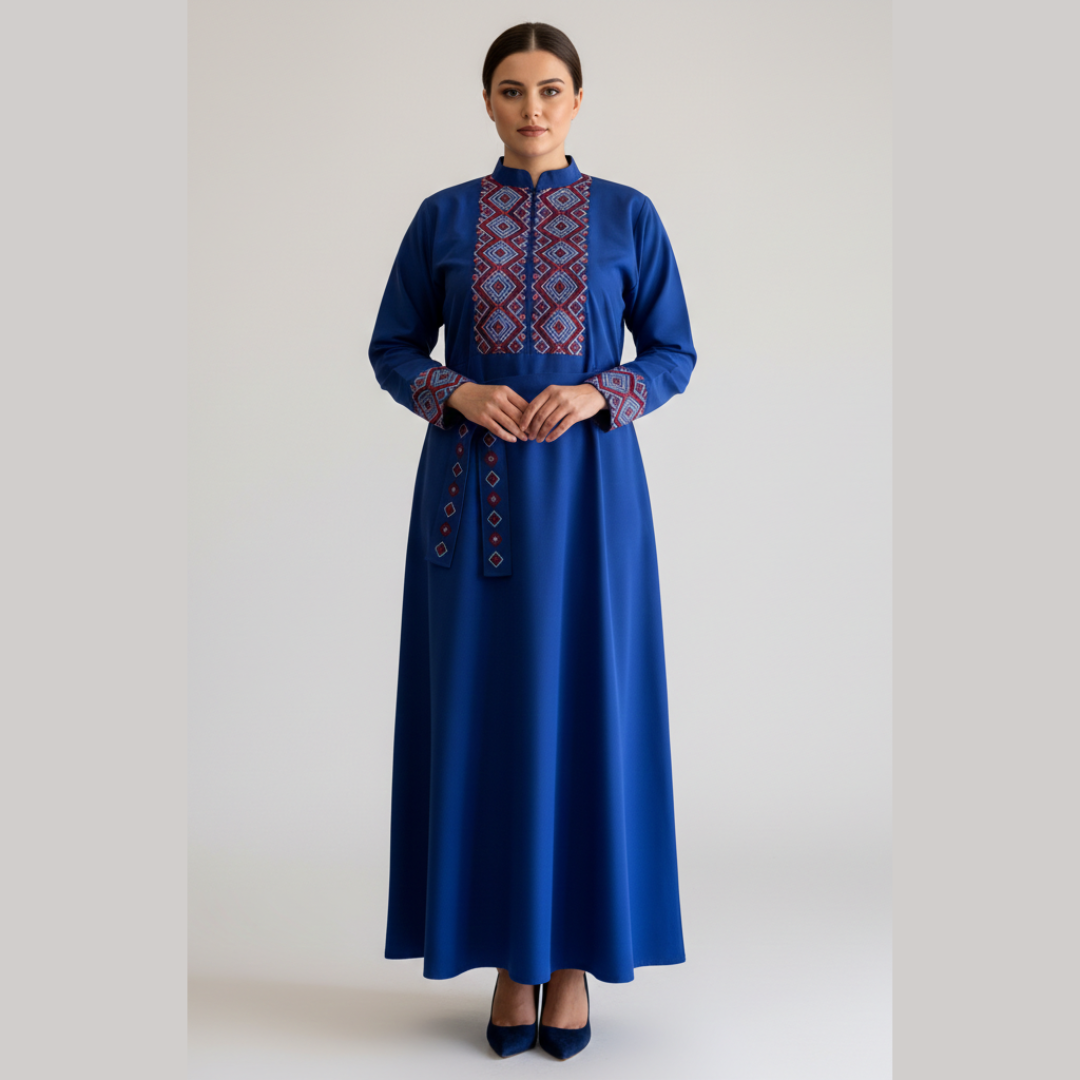 This elegant embroidered abaya long dress for women blends timeless modest fashion with refined craftsmanship. Designed in a flowing silhouette, the dress features intricate geometric embroidery along the front panel, cuffs, and waist tie, adding a sophisticated cultural touch to a contemporary design.