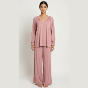 The lightweight, breathable fabric drapes beautifully on the body, making it ideal for lounging, home wear, travel, or casual daytime styling. The blush pink tone adds a subtle, feminine touch while maintaining a clean and modern aesthetic.