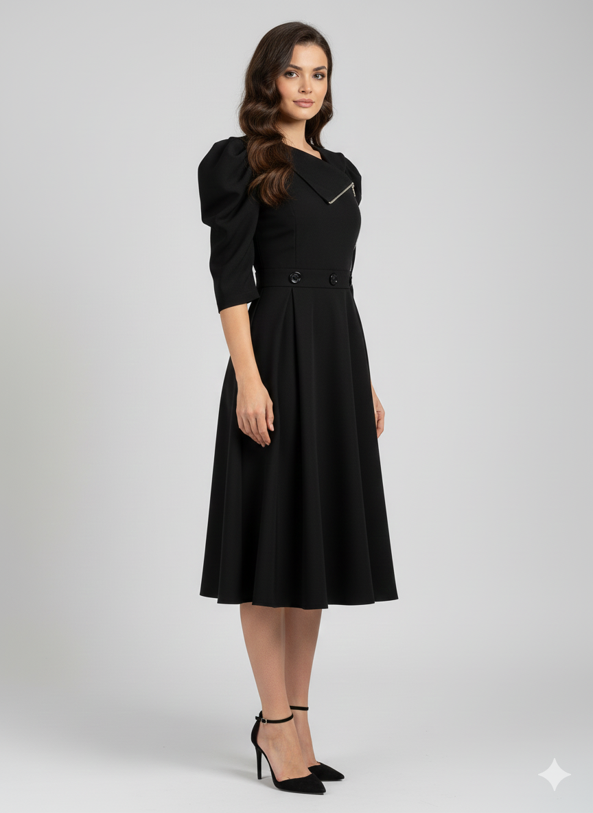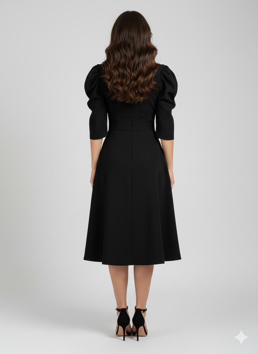 • Architectural Puff Sleeves: Structured, elbow-length sleeves with elasticated cuffs for a customizable, high-fashion volume.