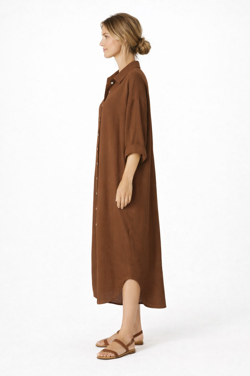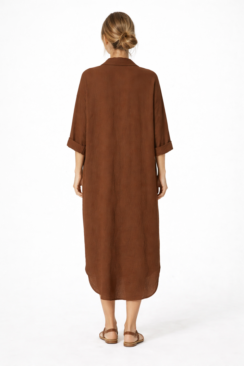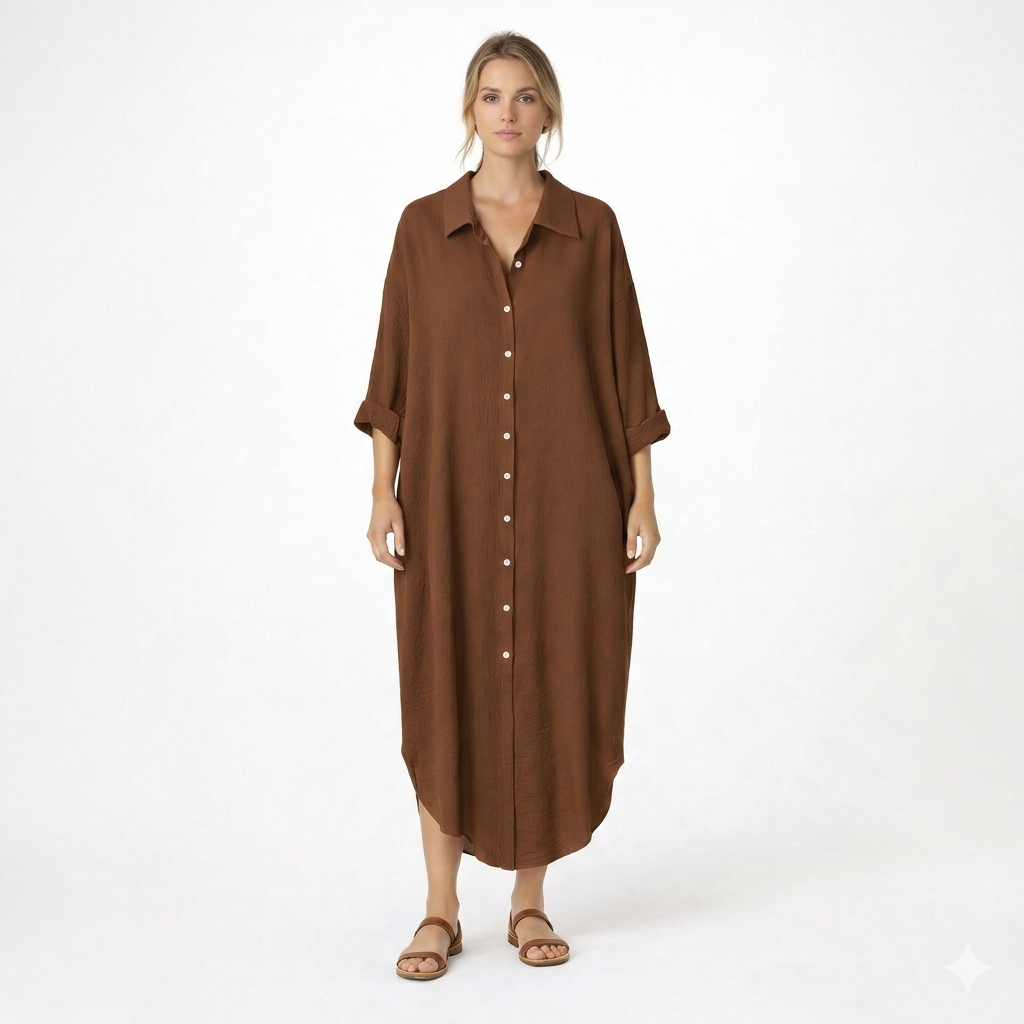 The flowing midi-length cut drapes beautifully, offering a flattering fit for all body shapes while ensuring maximum comfort throughout the day. The rich chocolate brown tone adds warmth and versatility, making it perfect for summer holidays, casual city wear, or relaxed weekend styling.