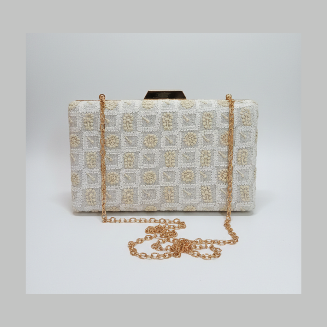Perfect for weddings, festive celebrations, formal evenings, and cultural events, this clutch offers a refined statement while keeping your essentials secure. The neutral ivory and beige tones make it easy to pair with both ethnic and modern outfits, adding timeless charm to your look.