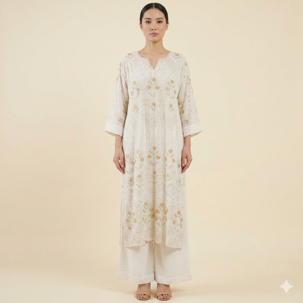 Refined and elegant, this ivory kurti and pant set is crafted from premium pure georgette and detailed with intricate silk thread hand embroidery and subtle gold sequin accents. The flattering silhouette features a structured neckline and soft cotton lining for breathable, all-day comfort.