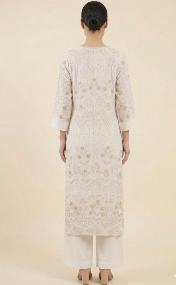 Women’s Ivory Georgette Kurti & Pant Set with Hand EmbroideryWomen’s Ivory Georgette Kurti & Pant Set with Hand Embroidery