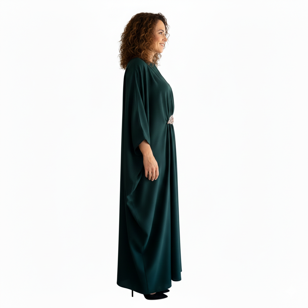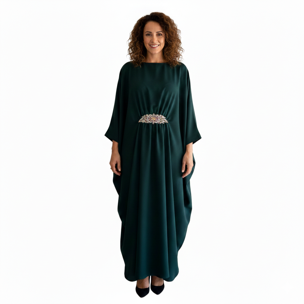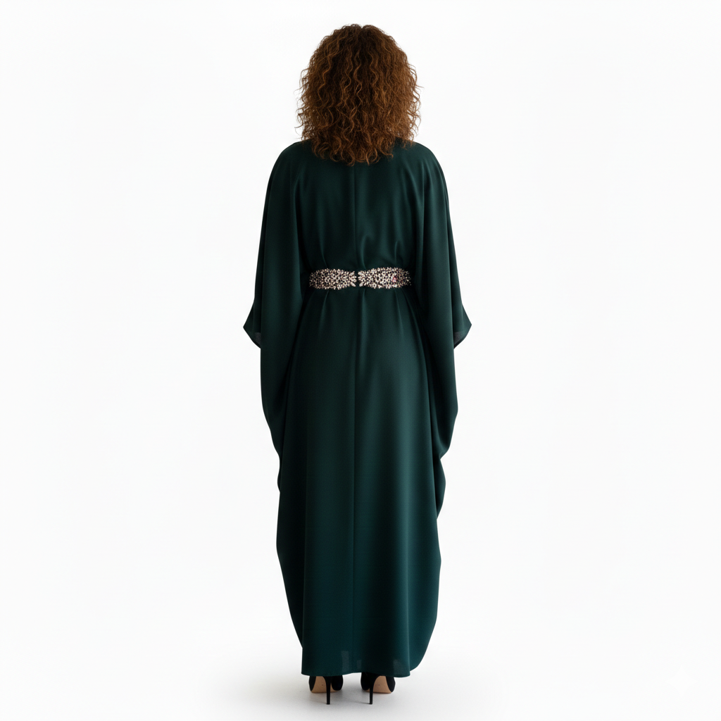 The waist is enhanced with delicate artisan embellishments, adding a refined focal detail without overpowering the design. Perfect for evening occasions, festive gatherings, and formal events, this kaftan reflects timeless elegance with a contemporary European aesthetic.