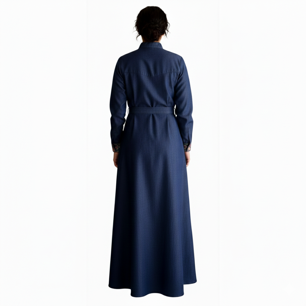 Product description: Elevate your modest wardrobe with this artisan-crafted long abaya jacket, made from premium unwashed denim designed to mature beautifully over time. A true celebration of eco-fashion, this piece blends durability, sustainability, and contemporary elegance in one timeless silhouette.