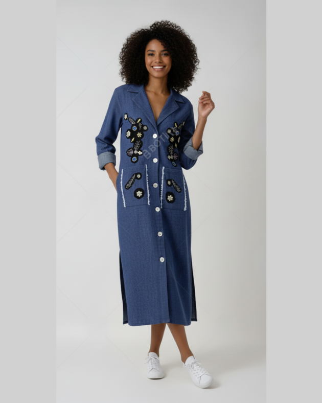 Elevate your seasonal wardrobe with our Artisan Long Denim Jacket. Crafted from premium, lightweight denim, this duster-length coat is the perfect transitional piece for cool European mornings and breezy evenings. Featuring intricate, hand-inspired floral embroidery across the chest and oversized utility pockets, it merges traditional craftsmanship with a modern silhouette. Its relaxed fit and side slits offer effortless movement, making it a versatile staple for city strolls or weekend escapes.