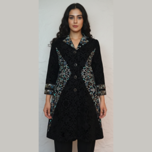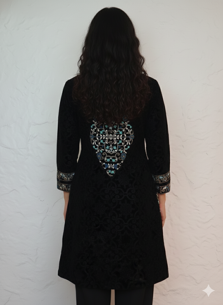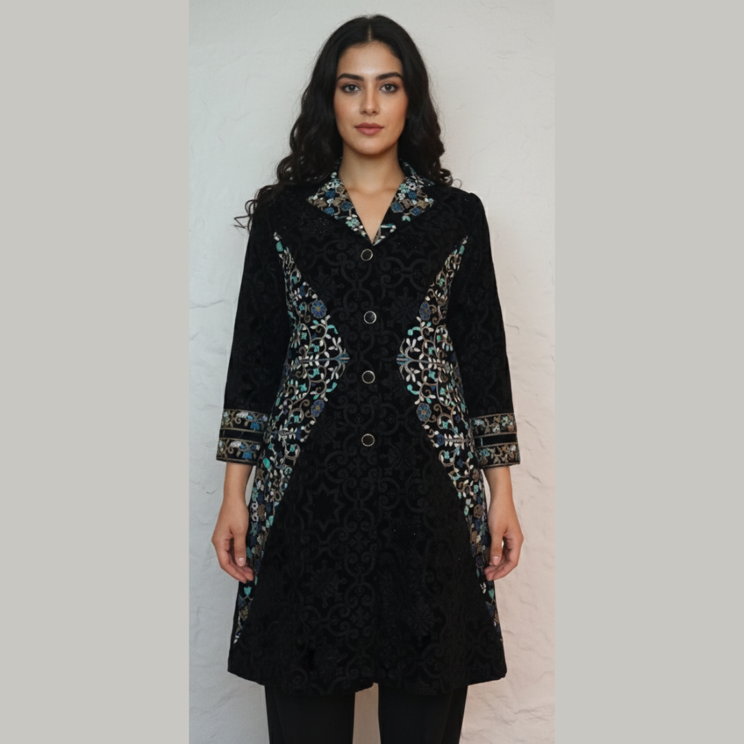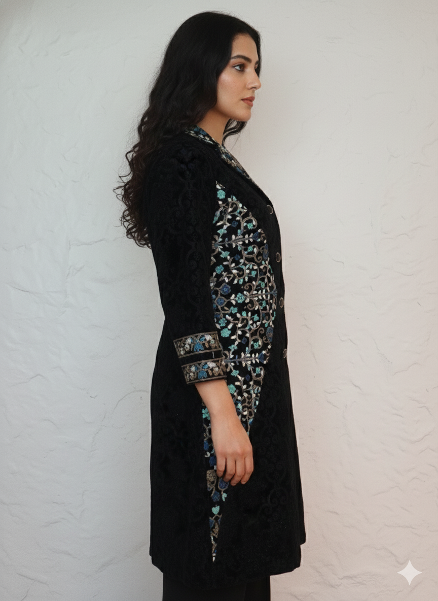 Indulge in the plush elegance of our Embroidered Velvet Long Jacket. This statement piece reimagines the classic duster silhouette in a rich, midnight-blue velvet that catches the light with every movement. Designed for the discerning European wardrobe, the jacket features high-density embroidery panels that add a regal, artisanal touch to the bodice and utility pockets.