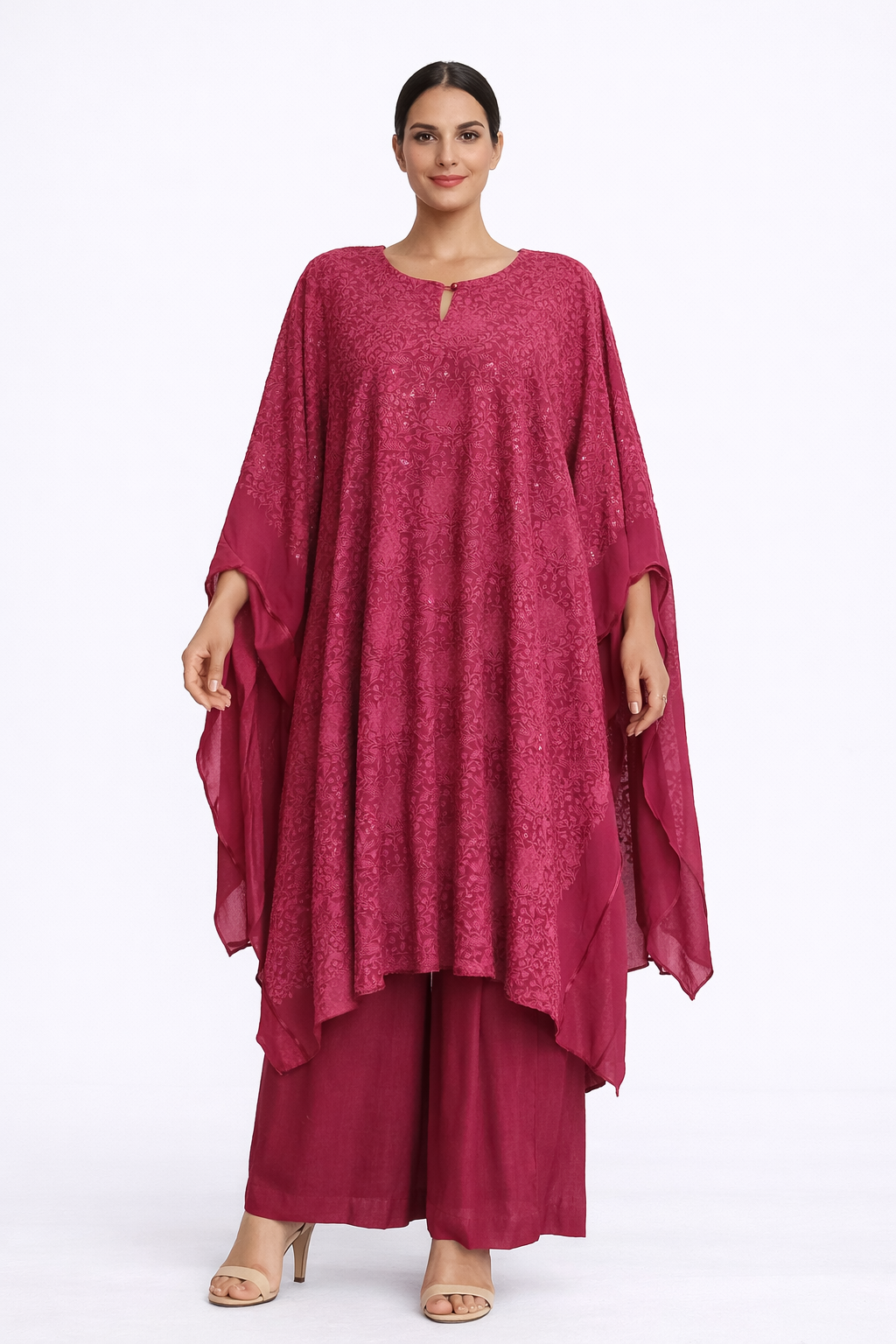 The accompanying wide-leg pants are fully stitched and designed to accommodate sizes up to 4XL with a 40-inch length. They feature a sophisticated flat-band front for a smooth silhouette and an elasticated back for all-day comfort. For added practicality, the pants also include convenient side pockets.
