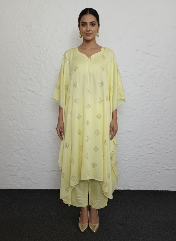 The semi-stitched kurti is crafted from premium glazed cotton fabric and features delicate threadwork embroidery enhanced with subtle sequin accents for a refined finish. Designed with a unique pre-finished neckline, overlocked sleeve edges, and neatly hemmed panels, the kurti offers a clean, polished look while requiring only minimal stitching for a customised fit.