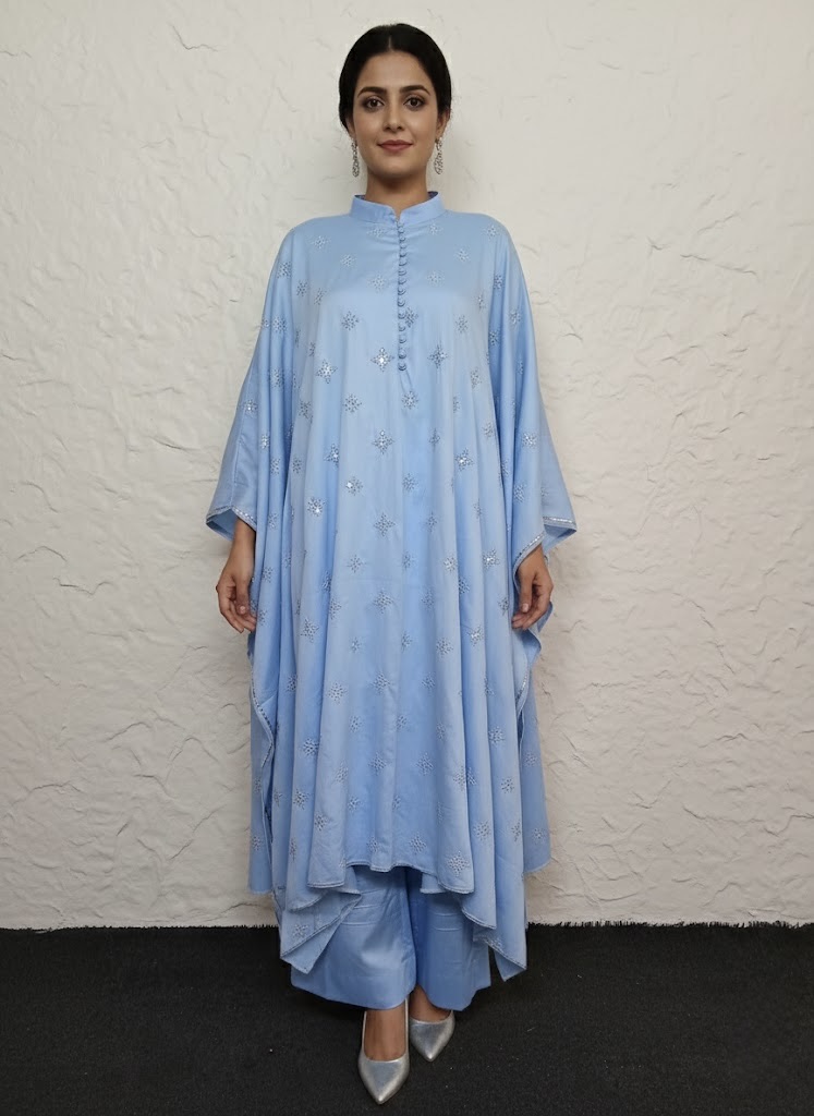 Detailed with elegant threadwork embroidery and subtle sequin highlights, the kurti delivers understated shimmer—ideal for both casual and occasion wear.