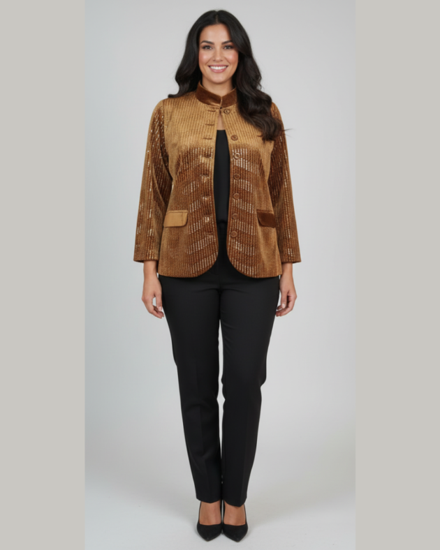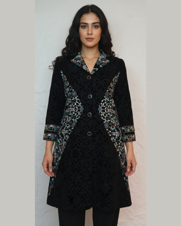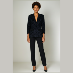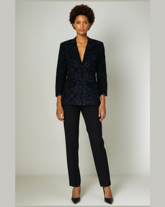 Define your evening silhouette with the Tonal Embroidered Velvet Short Jacket. This exquisite piece brings a touch of opulence to the classic cropped jacket. Crafted from high-density, midnight-blue velvet, it features sophisticated tonal embroidery that offers a subtle, 3D textural effect without overwhelming the garment’s clean lines. The shortened length makes it a perfect companion for high-waisted trousers or layering over a slip dress, providing a contemporary European edge to traditional evening wear.