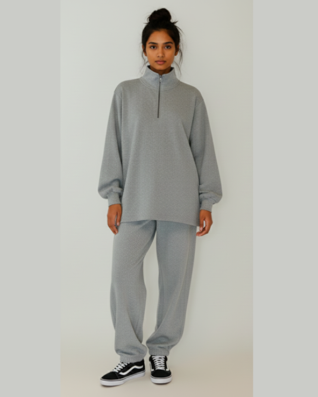 This women’s athleisure co-ord set is designed for relaxed European everyday style. Made from soft, stretchable poly knit fabric, the set includes a long-sleeve half-zip top with a clean collar finish and matching relaxed-fit trousers.